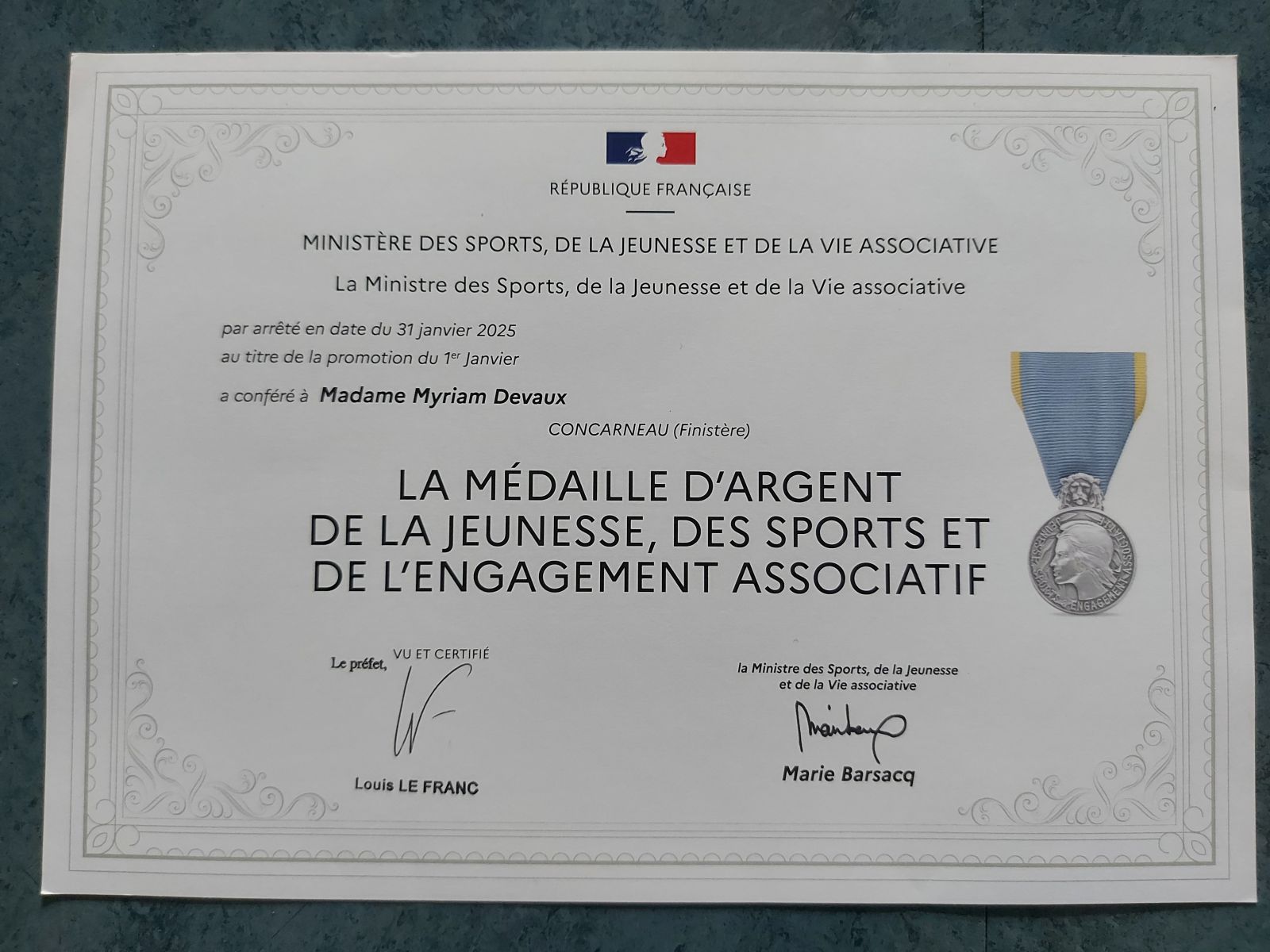 Une médaille d'argent Jeunesse et Sport reçue des mains du Préfet du Finistère, Monsieur Louis Le Franc, en présence de ma marraine Anne Goarnisson et de mon professeur Thomas Rocuet .