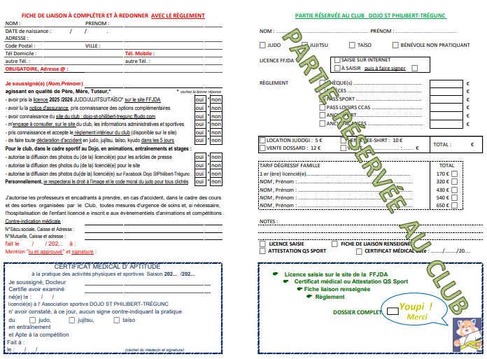5) DOSSIER D'INSCRIPTION à télécharger : FICHE DE LIAISON, seule la partie gauche est à compléter et à signer et à remettre avec votre règlement : FICHE DE LIAISON DOJO ST PHILIBERT-TREGUNC